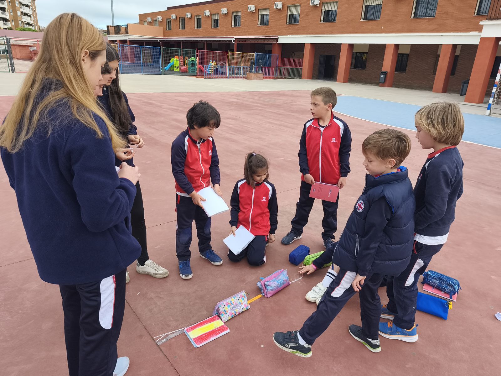 Los alumnos de segundo de primaria, con sus profesoras Elena y Soledad, participaron junto con los alumnos de cuarto de la ESO con sus profesoras Ana y Carolina en una actividad de comprensión y utilización de materiales y el propio cuerpo para el cálculo de las medidas de longitud formales e informales.